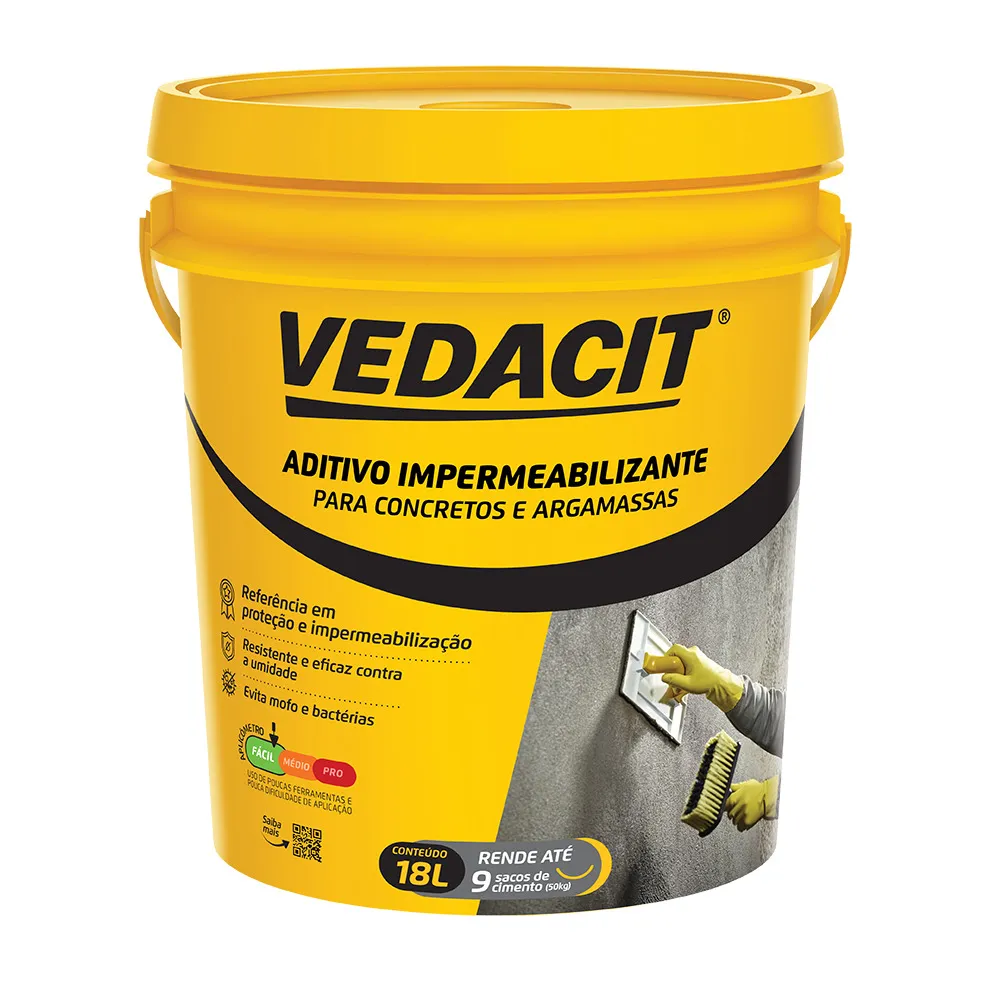 Aditivo líquido para argamassas e concretos, utilizado para aumentar a impermeabilidade e durabilidade das estruturas. Indicado para rebocos, fundações, caixas d’água e áreas sujeitas à umidade. Disponível nas versões de 18 litros e 900 mililitros.